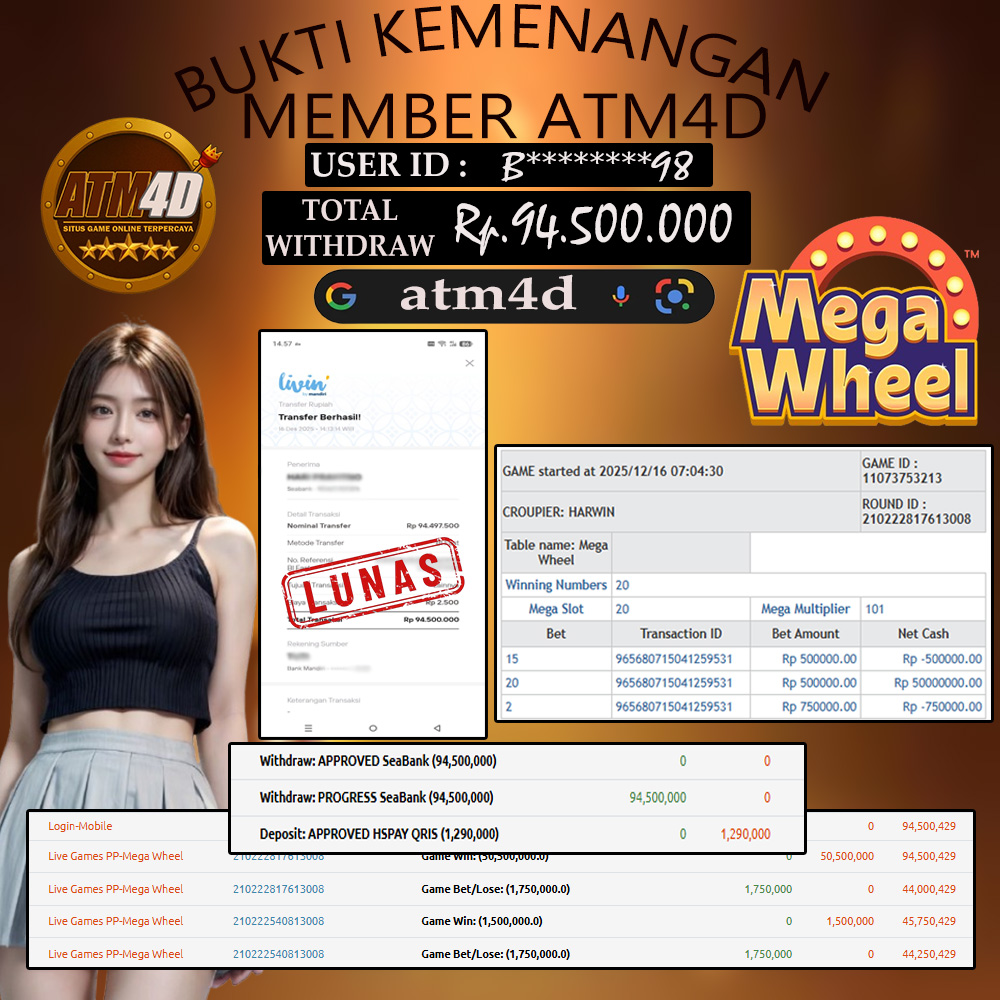 Jangan lewatkan kesempatan untuk meraih kemenangan besar. Daftar sekarang di ATM4D dan rasakan pengalaman bermain slot terbaik yang pernah ada! Putar gulungan, menangkan jackpot, dan jadilah bagian dari komunitas pemain sukses kami!