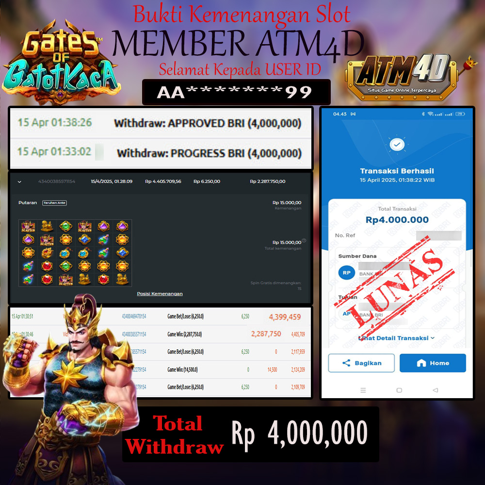 ATM4D – JACKPOT SLOT GACOR GEMS GATES OF GATOT KACA, Bukti Kemenangan , Kemenangan PRAGMATIC, Menang Platform online, Situs Aman Tergacor dan Aman, Withdraw Berapapun Pasti Di Bayar Langsung, Maxwin Slot Online.