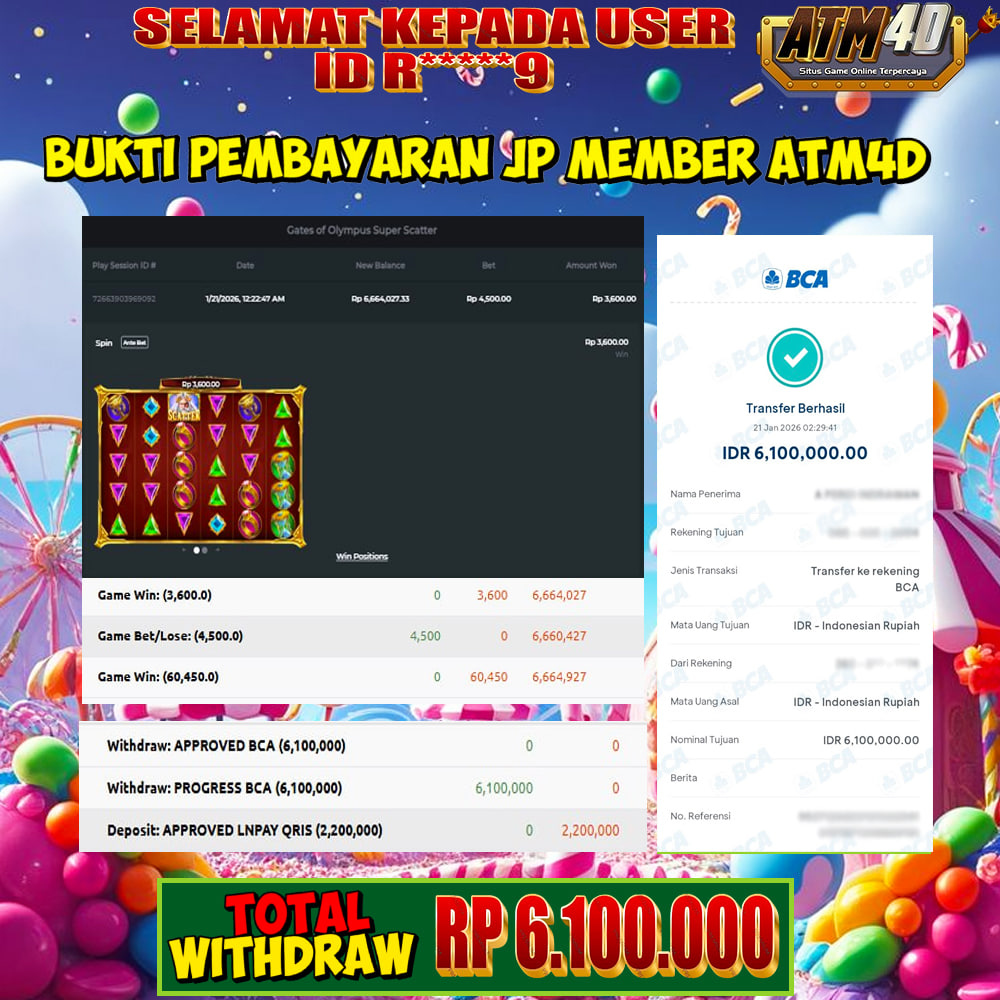 Jangan lewatkan kesempatan untuk meraih kemenangan besar. Daftar sekarang di ATM4D dan rasakan pengalaman bermain slot terbaik yang pernah ada! Putar gulungan, menangkan jackpot, dan jadilah bagian dari komunitas pemain sukses kami!
