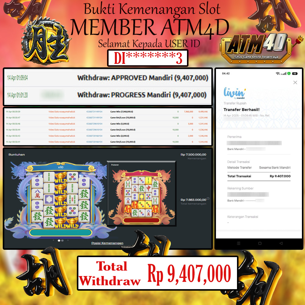 Jangan lewatkan kesempatan untuk meraih kemenangan besar. Daftar sekarang di ATM4D dan rasakan pengalaman bermain slot terbaik yang pernah ada! Putar gulungan, menangkan jackpot, dan jadilah bagian dari komunitas pemain sukses kami!